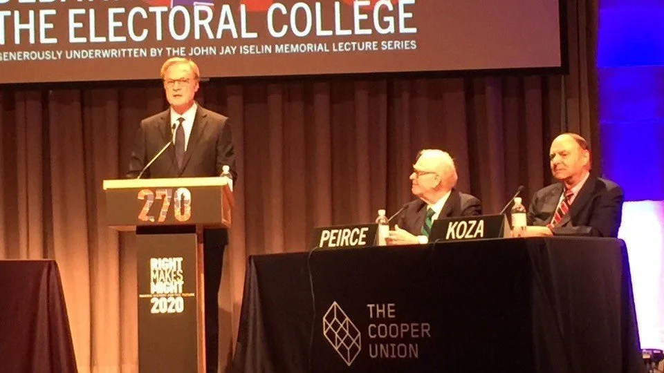 MSNOW's Lawrence O'Donnell, Moderator of Grand Hall at Cooper Union Debate IN 2019, introduces authors Neal Peirce and John Koza.